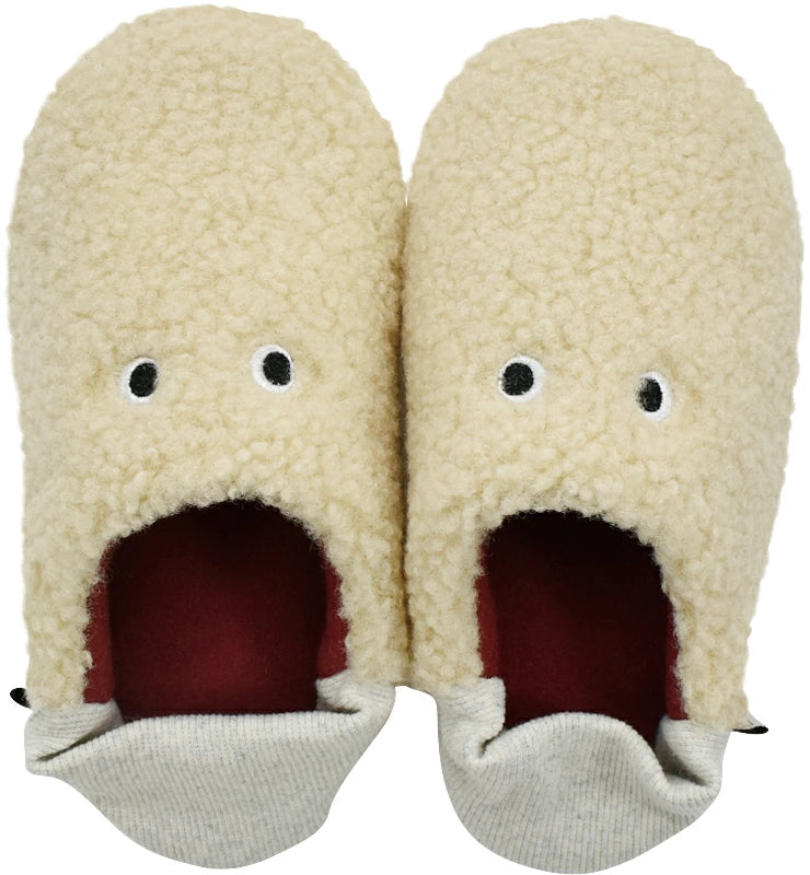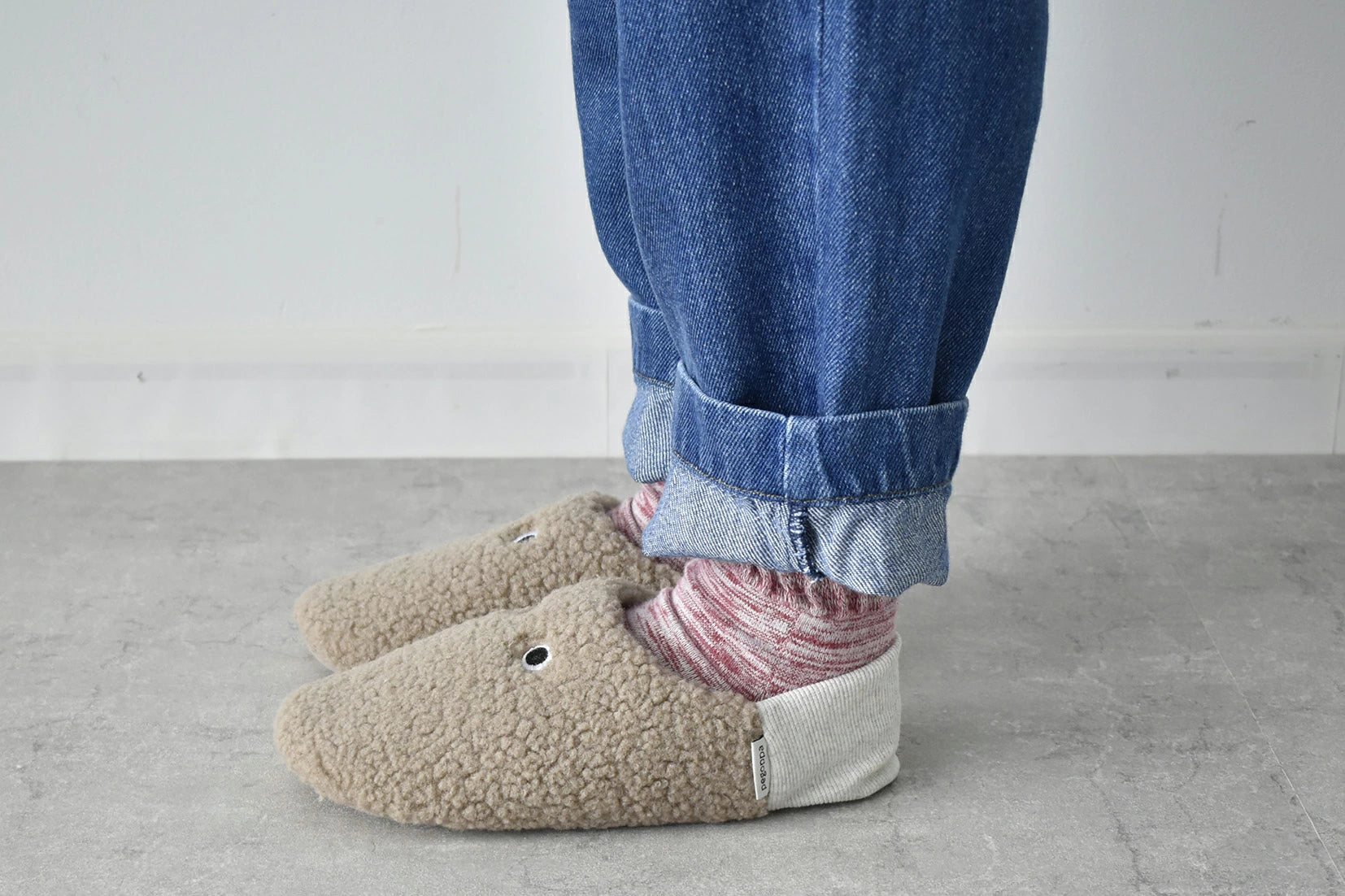 ペゴッパ=おなかすいた!羊のようなもこもこが愛らしい!家族みんなでほっこりできるルームシューズ。くっきりしたお目目がチャームポイントの可愛らしい表情。内側はフェルト素材を使用しクッション性のある気持ち良い履き心地。かかとは踏んでも立てても履ける2WAY仕様。ゴム入りで程良いホールド感。ソールは、フェイクスエード生地を使用し、滑りにくくなっています。