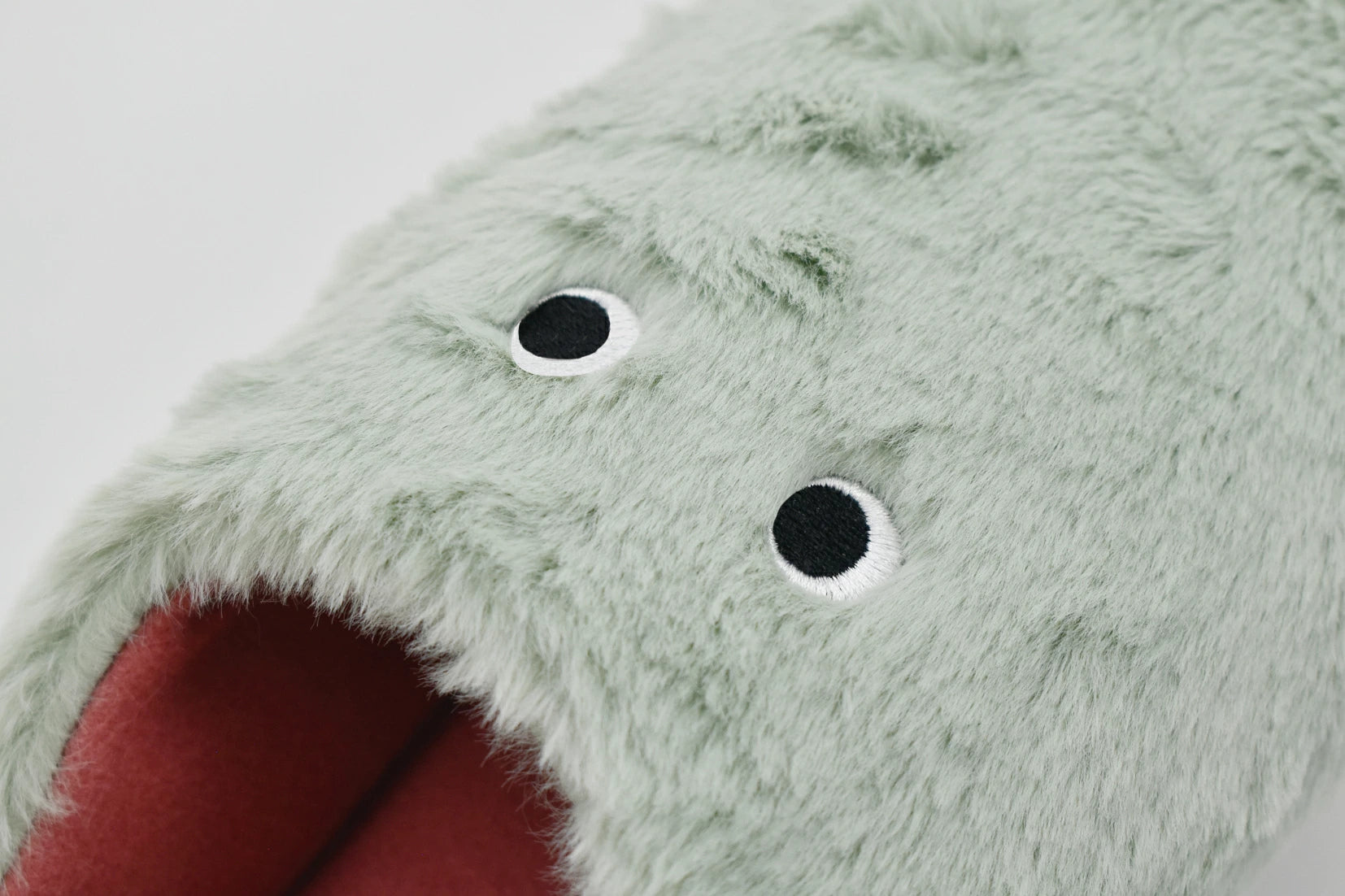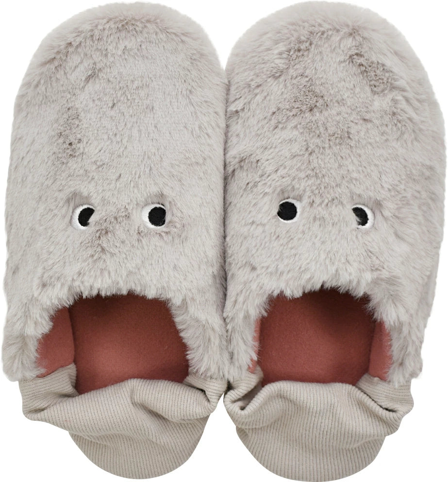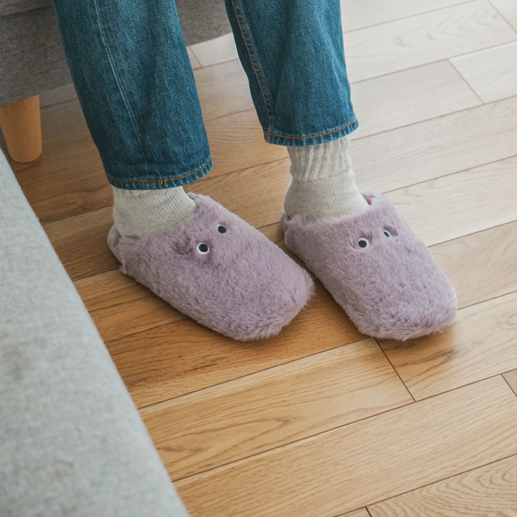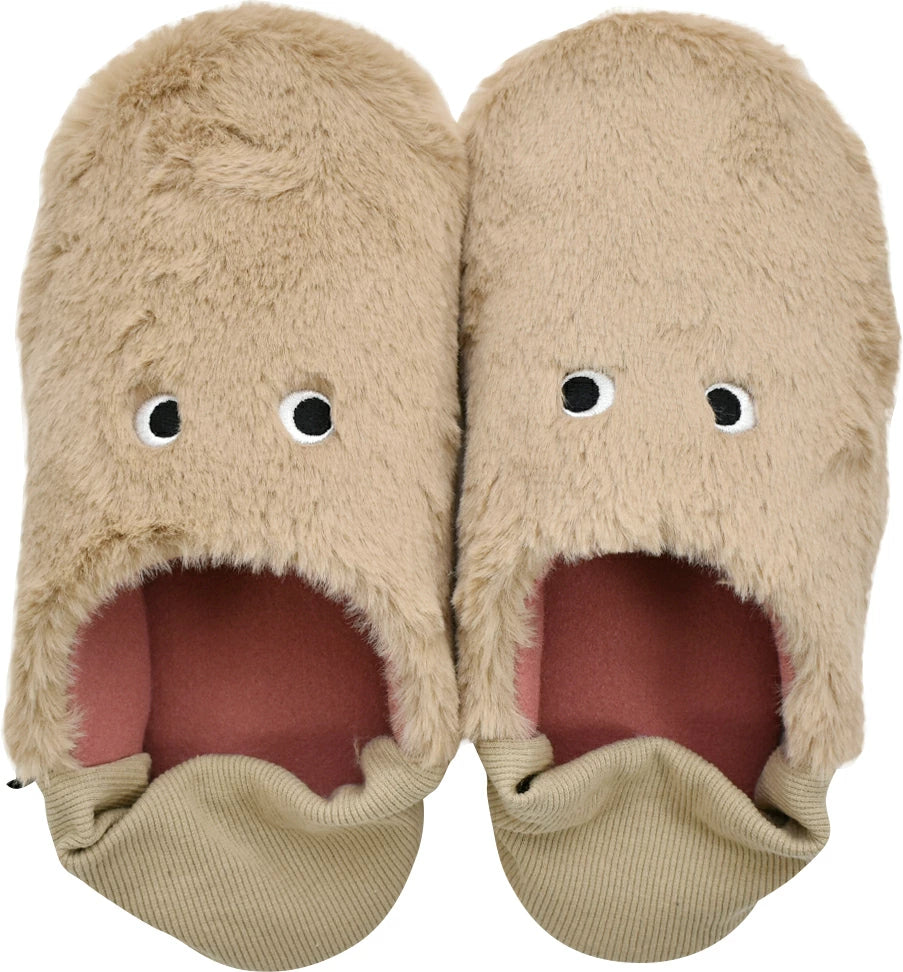 ペゴッパ=おなかすいた!ぬいぐるみのような柔らかいラビットファーと優しいカラーリングのルームシューズ。くっきりしたお目目がチャームポイントの可愛らしい表情。内側はフェルト素材を使用しクッション性のある気持ち良い履き心地。かかとは踏んでも立てても履ける2WAY仕様。ゴム入りで程良いホールド感。ソールは、フェイクスエード生地を使用し、滑りにくくなっています。