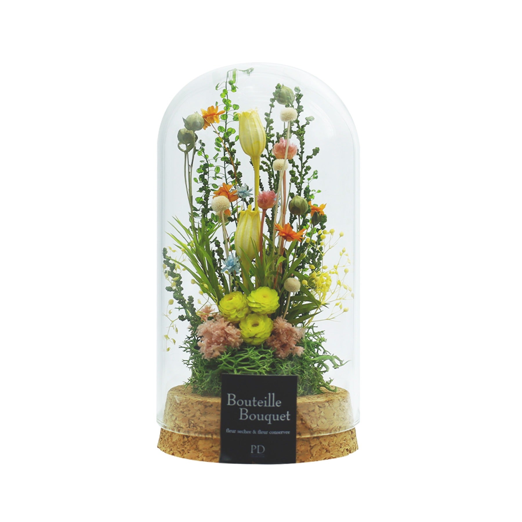 様々な品種の小さな草花でかわいらしくアレンジしたドーム型のコルクガラスシリーズ。